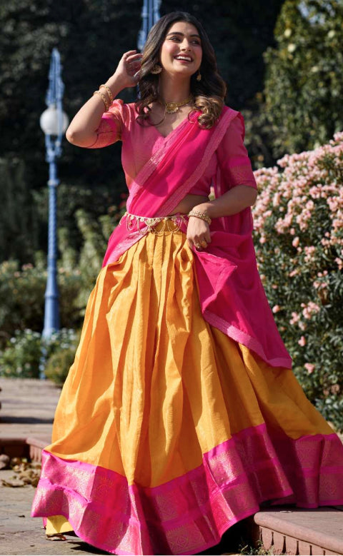 Presenting an ode to great tradition and style with our sareetra half sarees in graceful hues. Here’s to blending modern elegance with timeless South Indian heritage!